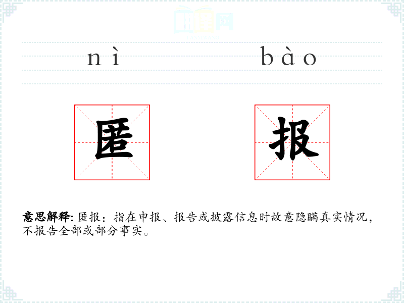 匿:源自古代汉语,意为隐藏、不显露。 报:源自古代汉语,意为告知、报告。 匿报:结合了隐藏和报告的含义,形成了故意隐瞒信息的特定词汇。