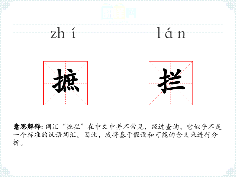 词汇“摭拦”在中文中并不常见,经过查询,它似乎不是一个标准的汉语词汇。因此,我将基于假设和可能的含义来进行分析。