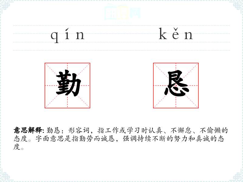 勤恳:形容词,指工作或学*时认真、不懈怠、不偷懒的态度。字面意思是指勤劳而诚恳,强调持续不断的努力和真诚的态度。