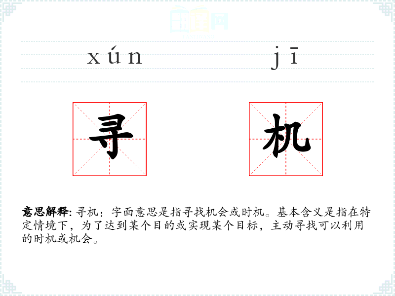 寻机:字面意思是指寻找机会或时机。基本含义是指在特定情境下,为了达到某个目的或实现某个目标,主动寻找可以利用的时机或机会。