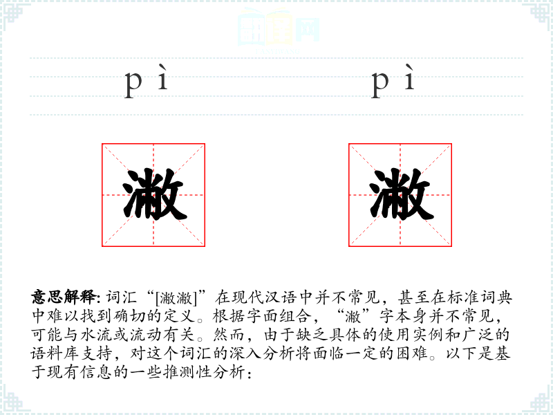综上所述,词汇“[潎潎]”由于缺乏具体的使用实例和广泛的语料库支持,对其进行深入分析存在较大困难。如果该词汇来源于某个特定方言或文学作品,建议查阅相关资料以获取更准确的信息。