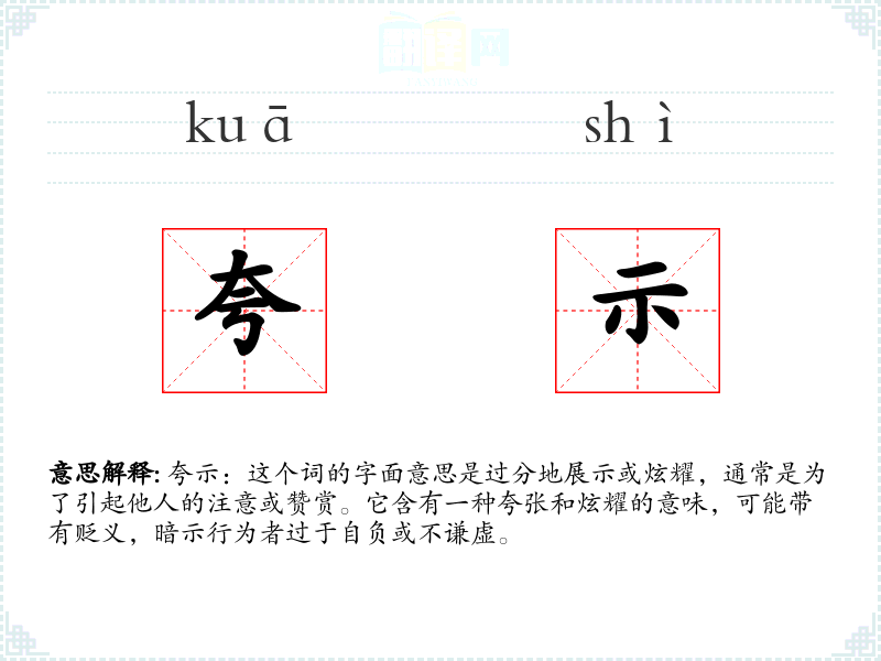 夸示:这个词的字面意思是过分地展示或炫耀,通常是为了引起他人的注意或赞赏。它含有一种夸张和炫耀的意味,可能带有贬义,暗示行为者过于自负或不谦虚。