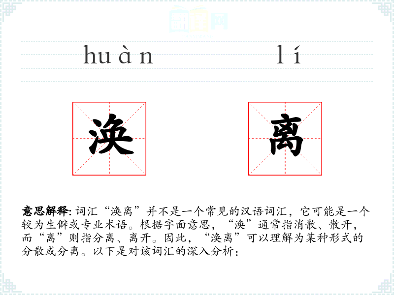 - 理解:“涣离”是一个描述分散和分离的词汇,虽然在日常语言中不常用,但在特定的语境和专业领域中可能有其独特的意义。