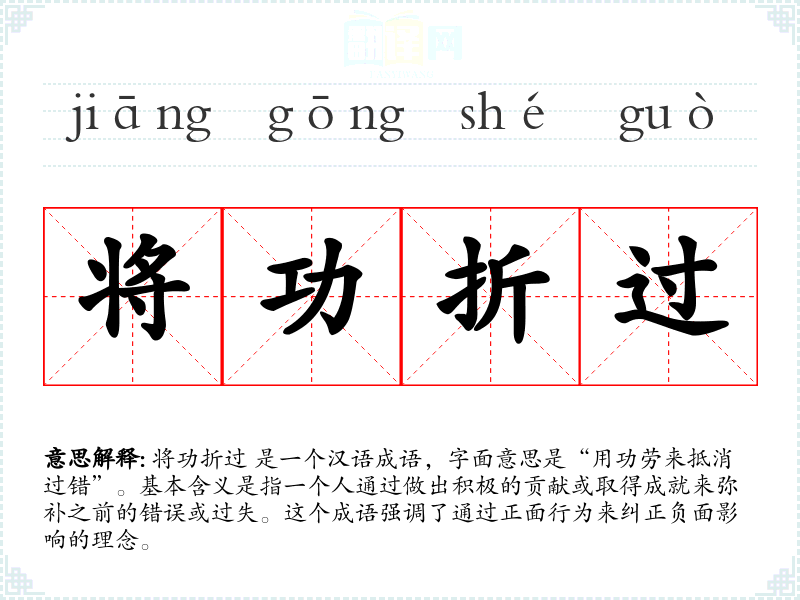 将功折过 是一个汉语成语,字面意思是“用功劳来抵消过错”。基本含义是指一个人通过做出积极的贡献或取得成就来弥补之前的错误或过失。这个成语强调了通过正面行为来纠正负面影响的理念。