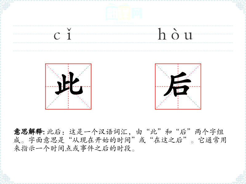 此后:这是一个汉语词汇,由“此”和“后”两个字组成。字面意思是“从现在开始的时间”或“在这之后”。它通常用来指示一个时间点或**之后的时段。