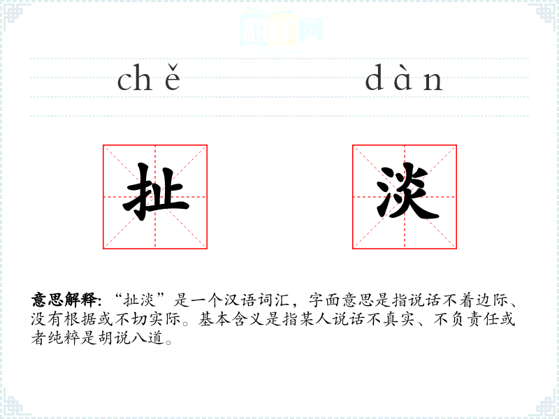 “扯淡”是一个汉语词汇,字面意思是指说话不着边际、没有根据或不切实际。基本含义是指某人说话不真实、不负责任或者纯粹是胡说八道。