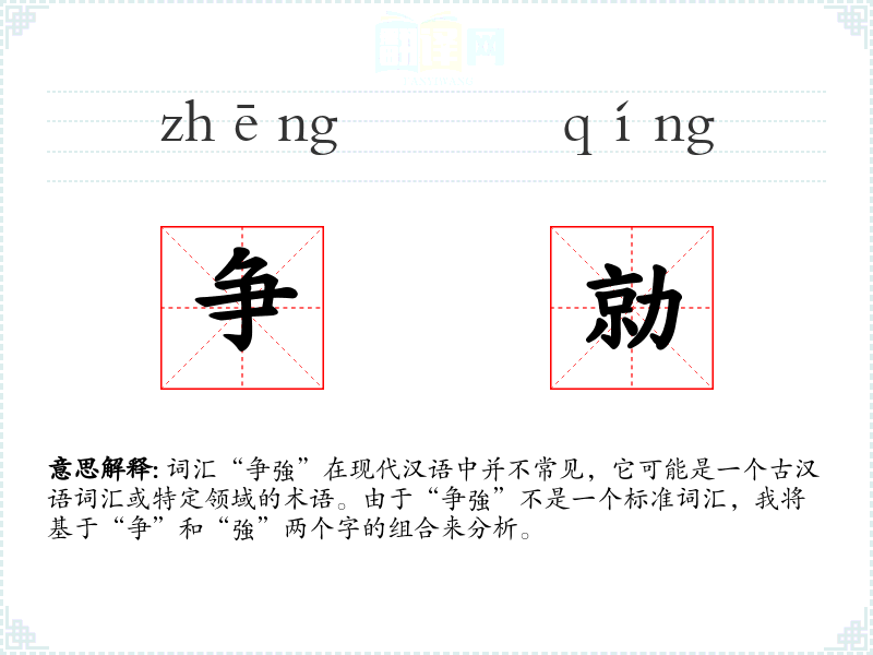 “争”字通常表示竞争、争夺或争论,而“強”字表示强大、有力。因此,“争強”可以理解为在竞争中力求变得更强或争夺优势。