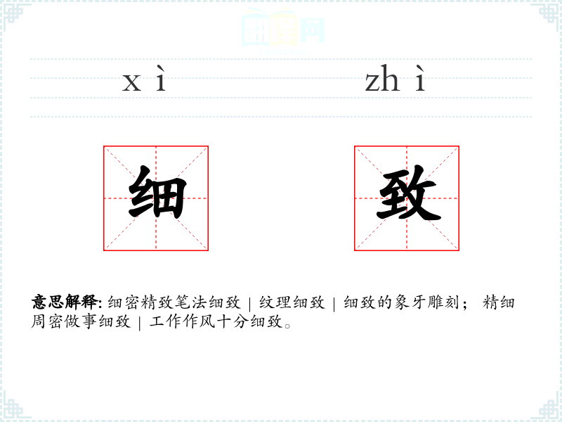 细密精致笔法细致|纹理细致|细致的象牙雕刻; 精细周密做事细致|工作作风十分细致。