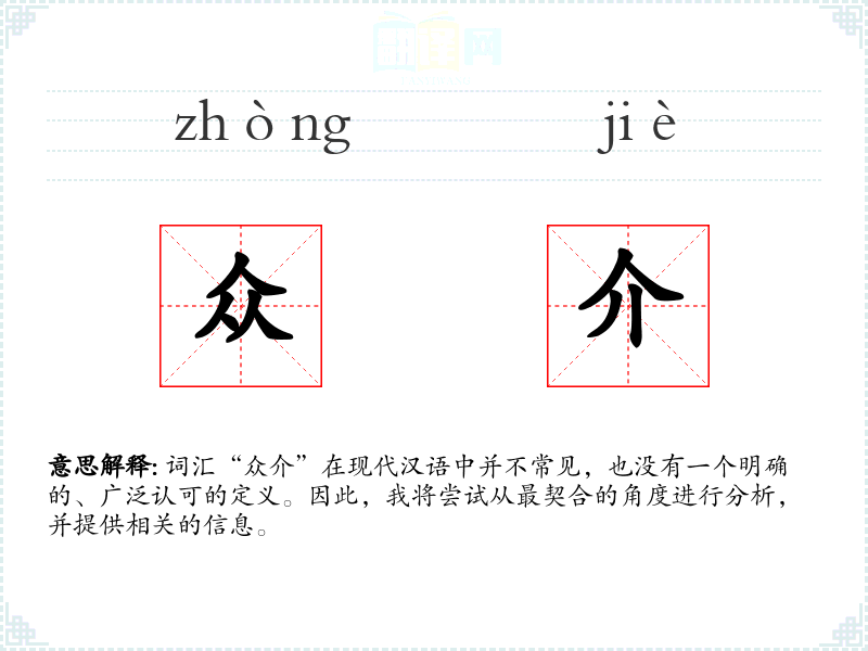 由于“众介”不是一个标准词汇,我们可以尝试从字面意思来解释: