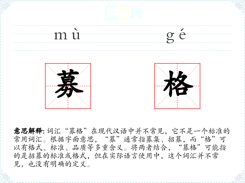 词汇“募格”在现代汉语中并不常见,它不是一个标准的常用词汇。根据字面意思,“募”通常指募集、招募,而“格”可以有格式、标准、品质等多重含义。将两者结合,“募格”可能指的是招募的标准或格式,但在实际语言使用中,这个词汇并不常见,也没有明确的定义。