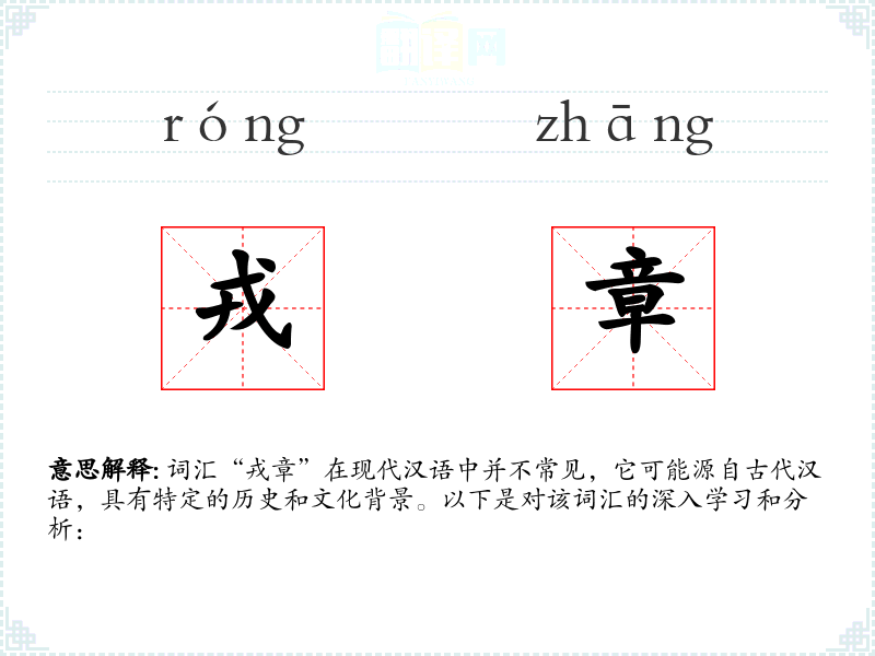 词汇“戎章”在现代汉语中并不常见,它可能源自古代汉语,具有特定的历史和文化背景。以下是对该词汇的深入学*和分析: