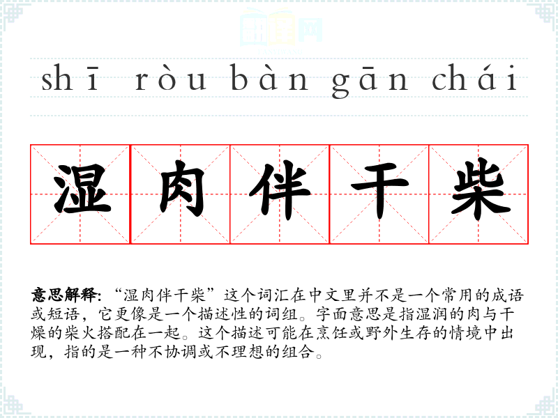 “湿肉伴干柴”这个词汇虽然不是一个常用的成语,但它提供了一个形象的比喻,用来描述不协调或不理想的状况。在语言学习和表达中,这样的词汇可以帮助我们更生动地描述和理解周围的世界。