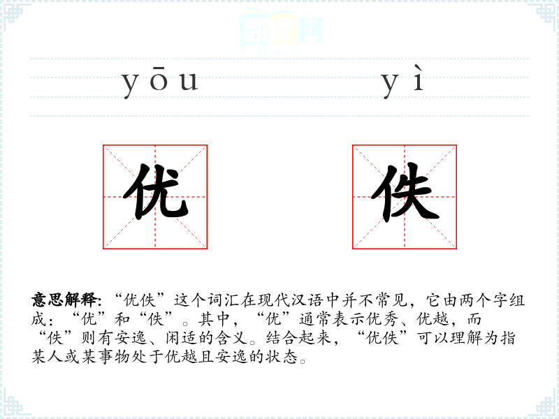 “优佚”这个词汇在现代汉语中并不常见,它由两个字组成:“优”和“佚”。其中,“优”通常表示优秀、优越,而“佚”则有安逸、闲适的含义。结合起来,“优佚”可以理解为指某人或某事物处于优越且安逸的状态。