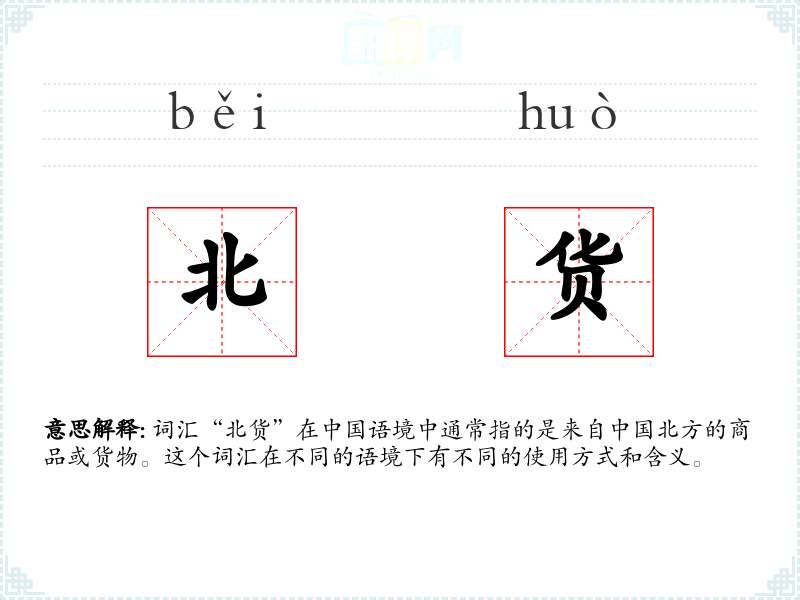 词汇“北货”在语境中通常指的是来自北方的商品或货物。这个词汇在不同的语境下有不同的使用方式和含义。