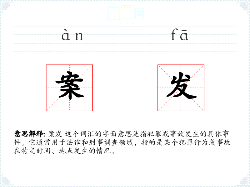 案发 这个词汇的字面意思是指犯罪或事故发生的具体**。它通常用于法律和刑事调查领域,指的是某个犯罪行为或事故在特定时间、地点发生的情况。