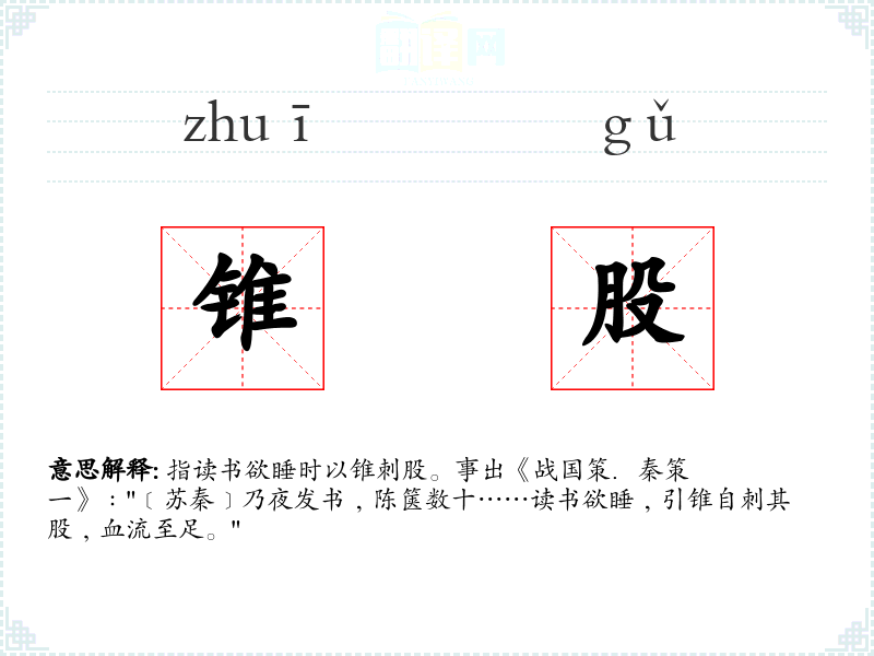 指读书欲睡时以锥刺股。事出《战国策.秦策一》﹕"﹝苏秦﹞乃夜发书﹐陈箧数十……读书欲睡﹐引锥自刺其股﹐血流至足。"
