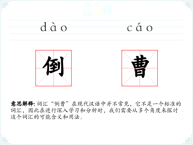 词汇“倒曹”在现代汉语中并不常见,它不是一个标准的词汇,因此在进行深入学*和分析时,我们需要从多个角度来探讨这个词汇的可能含义和用法。