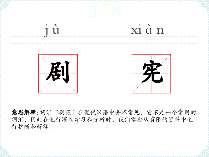 总的来说,“剧宪”不是一个常用词汇,其含义和使用都非常有限。在语言学习和表达中,它可能不是一个重要的词汇。如果要在特定语境下使用,需要创造性的解释和应用。