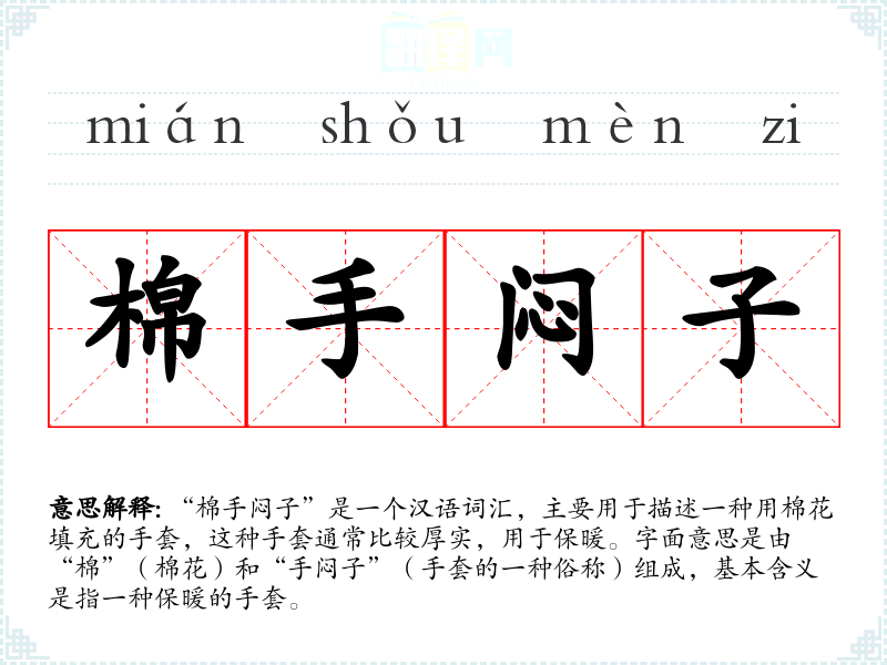“棉手闷子”是一个汉语词汇,主要用于描述一种用棉花填充的手套,这种手套通常比较厚实,用于保暖。字面意思是由“棉”(棉花)和“手闷子”(手套的一种俗称)组成,基本含义是指一种保暖的手套。