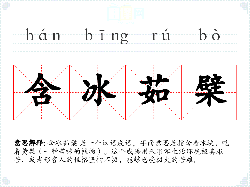 含冰茹檗 是一个汉语成语,字面意思是指含着冰块,吃着黄檗(一种苦味的植物)。这个成语用来形容生活环境极其艰苦,或者形容人的性格坚韧不拔,能够忍受极大的苦难。