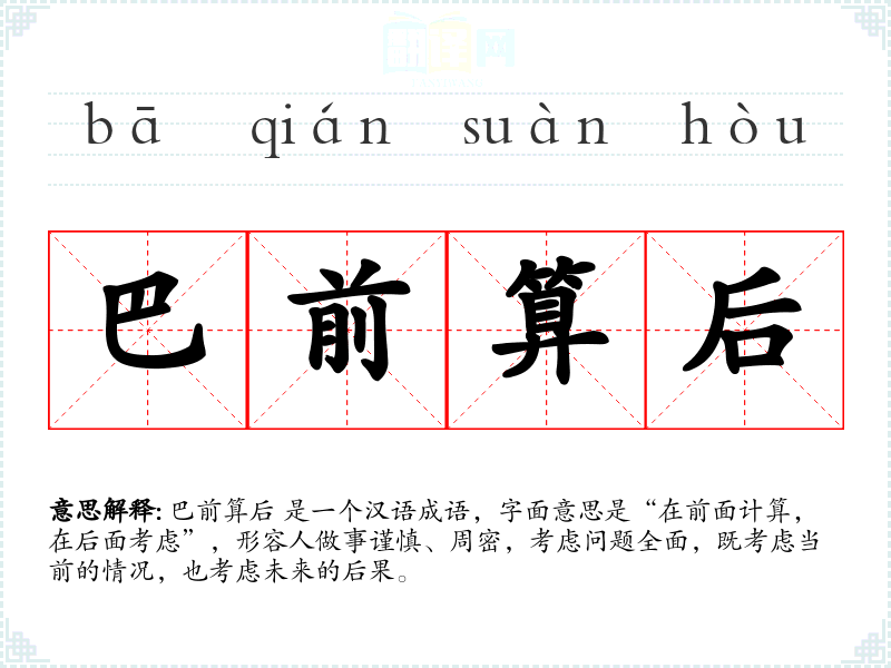 巴前算后 是一个汉语成语,字面意思是“在前面计算,在后面考虑”,形容人做事谨慎、周密,考虑问题全面,既考虑当前的情况,也考虑未来的后果。