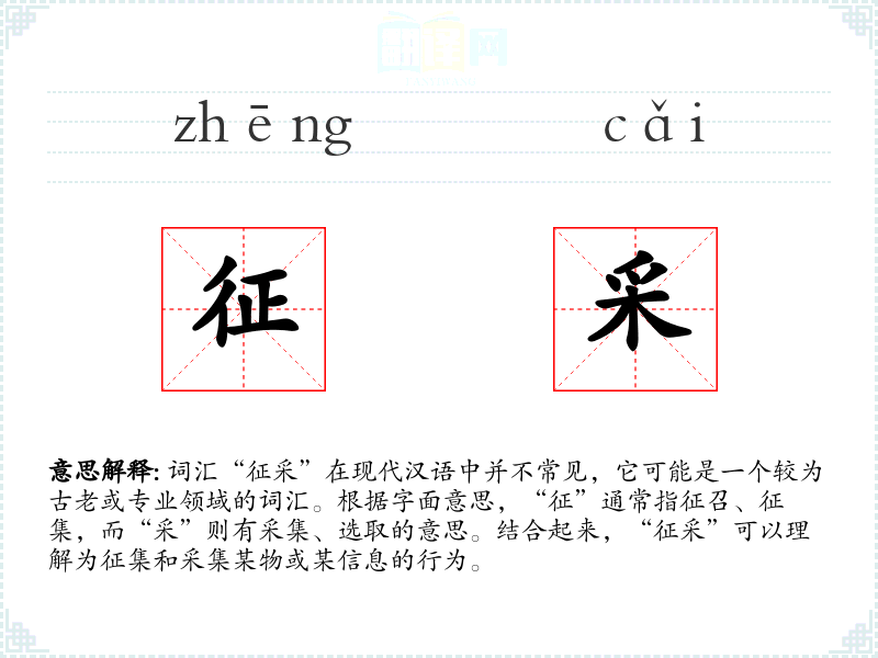 词汇“征采”在现代汉语中并不常见,它可能是一个较为古老或专业领域的词汇。根据字面意思,“征”通常指征召、征集,而“采”则有采集、选取的意思。结合起来,“征采”可以理解为征集和采集某物或某信息的行为。