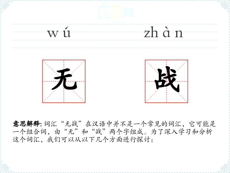 词汇“无战”在汉语中并不是一个常见的词汇,它可能是一个组合词,由“无”和“战”两个字组成。为了深入学*和分析这个词汇,我们可以从以下几个方面进行探讨: