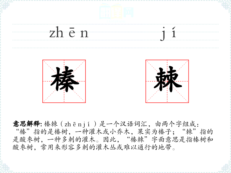 榛棘(zhēn jí)是一个汉语词汇,由两个字组成:“榛”指的是榛树,一种灌木或小乔木,果实为榛子;“棘”指的是酸枣树,一种多刺的灌木。因此,“榛棘”字面意思是指榛树和酸枣树,常用来形容多刺的灌木丛或难以通行的地带。
