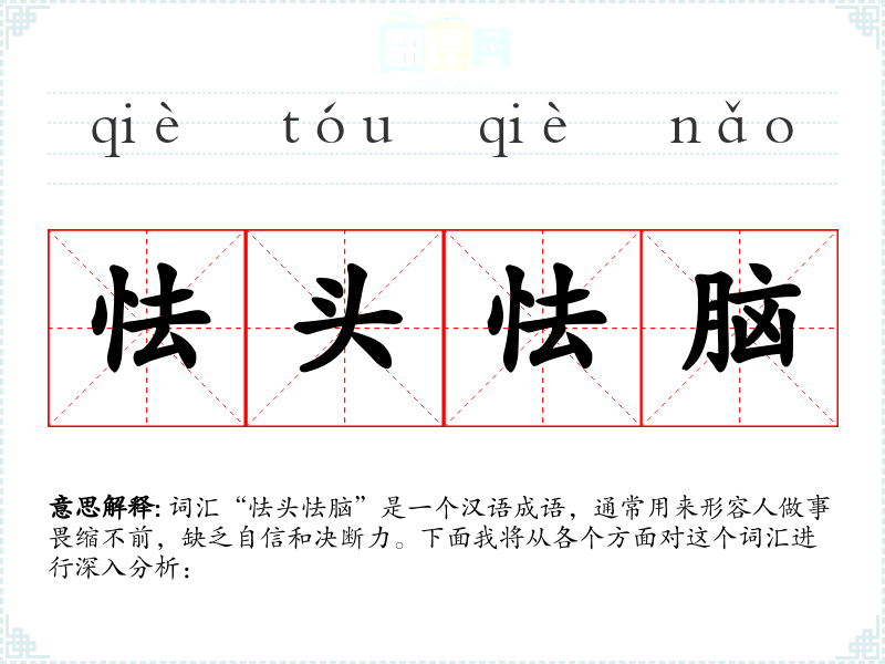词汇“怯头怯脑”是一个汉语成语,通常用来形容人做事畏缩不前,缺乏自信和决断力。下面我将从各个方面对这个词汇进行深入分析: