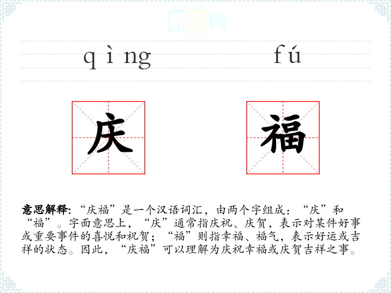 - 专业领域:在**或传统文化领域,“庆福”可能特指某种仪式或活动,如“庆福法会”。