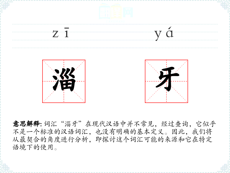 如果“淄牙”是一个方言词汇,它可能在某个地区的口语中有所使用,但在普通话或标准汉语中不常见。如果是网络新词,它可能出现在特定的社交媒体或网络论坛中,用于表达特定的情感或概念。