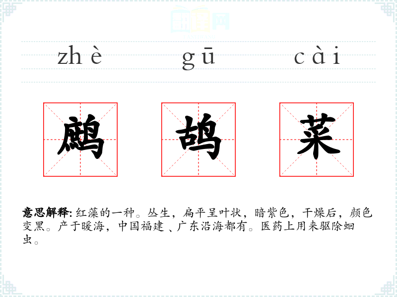 红藻的一种。丛生,扁平呈叶状,暗紫色,干燥后,颜色变黑。产于暖海,中国福建﹑广东沿海都有。医药上用来驱除蛔虫。