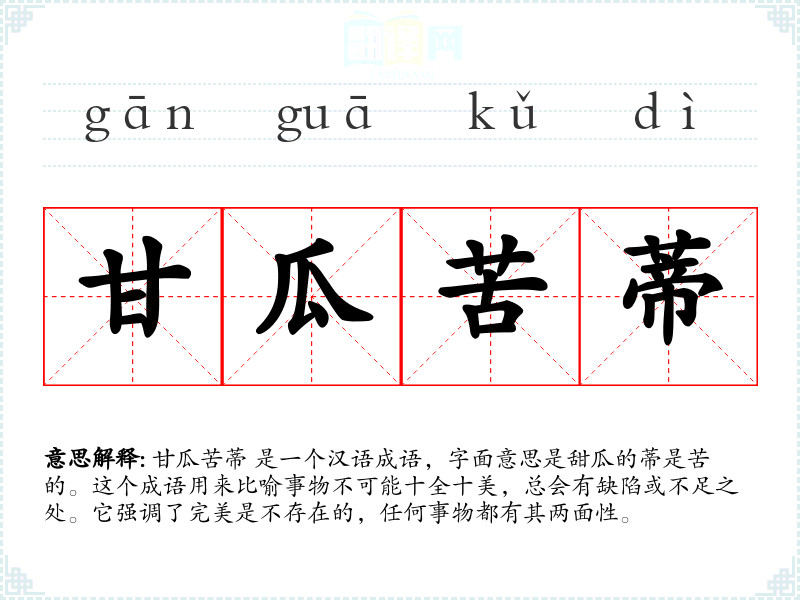 甘瓜苦蒂 是一个汉语成语,字面意思是甜瓜的蒂是苦的。这个成语用来比喻事物不可能十全十美,总会有缺陷或不足之处。它强调了完美是不存在的,任何事物都有其两面性。