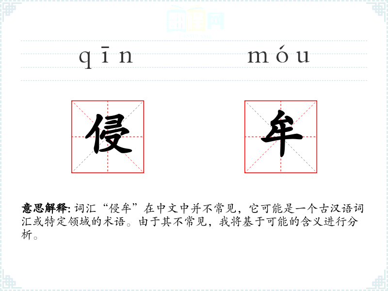 词汇“侵牟”在中文中并不常见,它可能是一个古汉语词汇或特定领域的术语。由于其不常见,我将基于可能的含义进行分析。