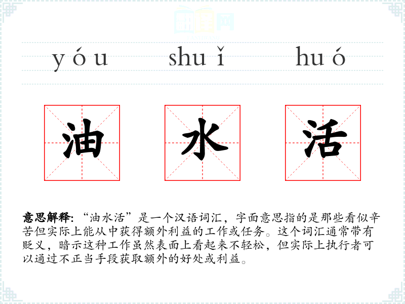 “油水活”是一个汉语词汇,字面意思指的是那些看似辛苦但实际上能从中获得额外利益的工作或任务。这个词汇通常带有贬义,暗示这种工作虽然表面上看起来不轻松,但实际上执行者可以通过不正当手段获取额外的好处或利益。