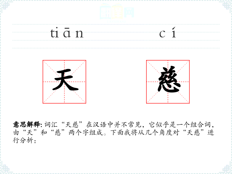 - “天”和“慈”都是古老的汉字,它们的组合可能是现代创造的词汇,用于特定的**或哲学语境。