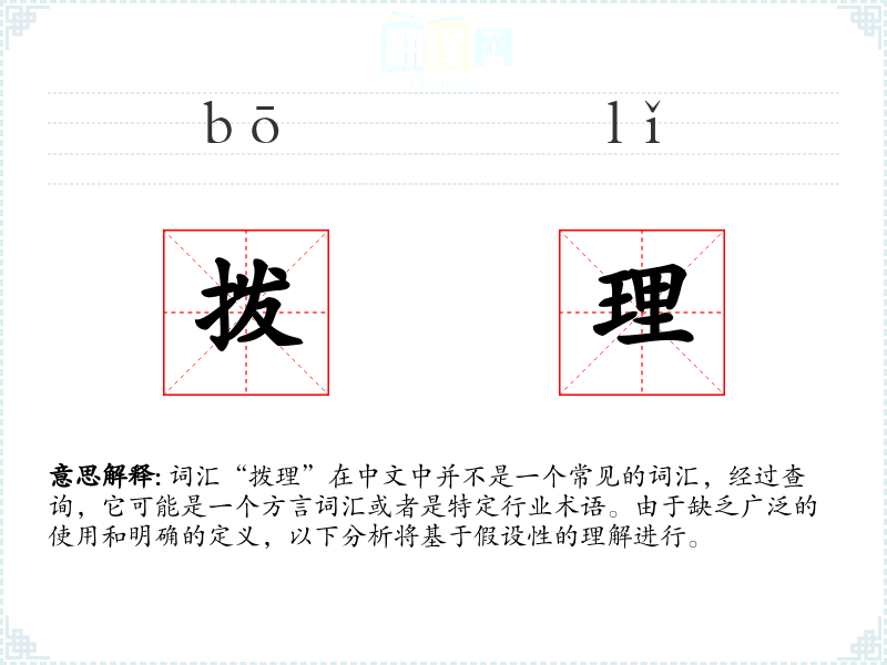 词汇“拨理”在中文中并不是一个常见的词汇,经过查询,它可能是一个方言词汇或者是特定行业术语。由于缺乏广泛的使用和明确的定义,以下分析将基于假设性的理解进行。