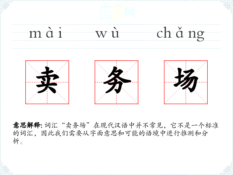词汇“卖务场”在现代汉语中并不常见,它不是一个标准的词汇,因此我们需要从字面意思和可能的语境中进行推测和分析。