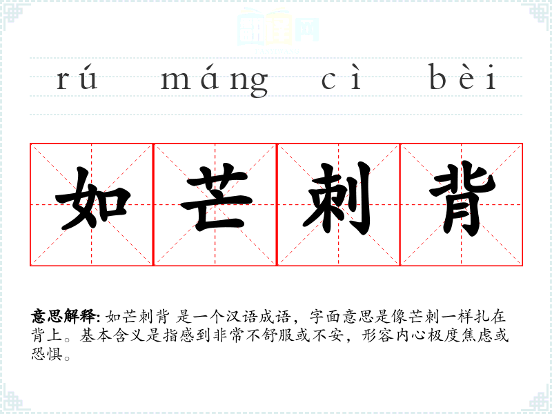 如芒刺背 是一个汉语成语,字面意思是像芒刺一样扎在背上。基本含义是指感到非常不舒服或不安,形容内心极度焦虑或恐惧。