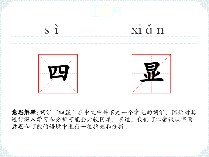“四显”作为一个不常见的词汇,其具体含义和用法需要更多的上下文信息来确定。在语言学习和表达中,了解词汇的具体用法和语境是非常重要的。由于“四显”不是一个常用词汇,对其进行深入分析可能会受到限制。