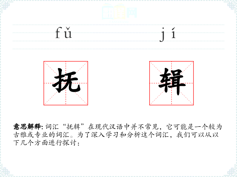 词汇“抚辑”在现代汉语中并不常见,它可能是一个较为古雅或专业的词汇。为了深入学*和分析这个词汇,我们可以从以下几个方面进行探讨: