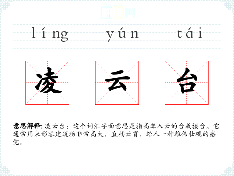 凌云台:这个词汇字面意思是指高耸入云的台或楼台。它通常用来形容建筑物非常高大,直插云霄,给人一种雄伟壮观的感觉。