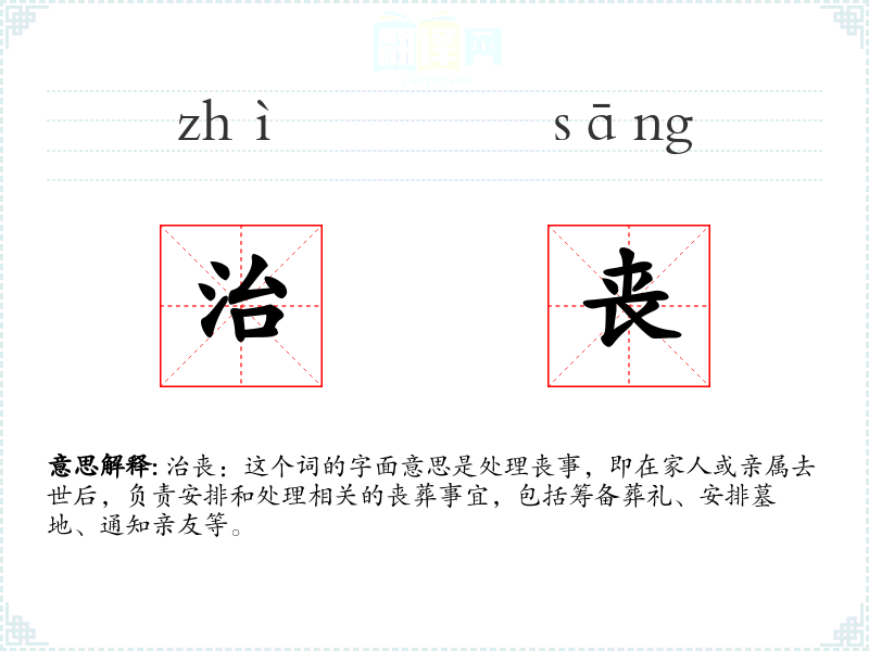 治丧:这个词的字面意思是处理丧事,即在家人或亲属去世后,负责安排和处理相关的丧葬事宜,包括筹备葬礼、安排墓地、通知亲友等。