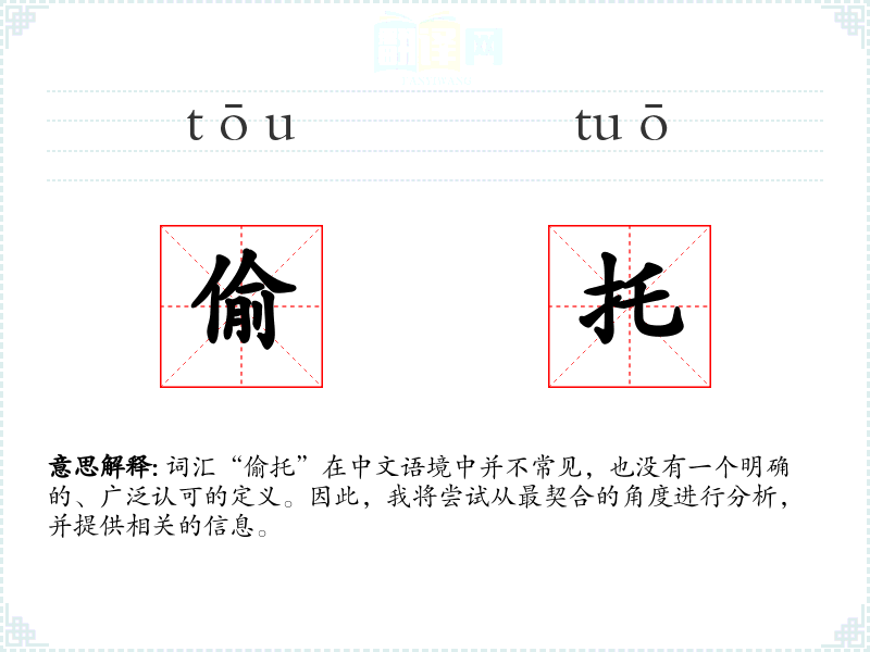 由于“偷托”不是一个标准的词汇,我们无法给出一个确切的基本定义。它可能是由“偷”和“托”两个字组合而成的非标准词汇,但具体含义不明确。