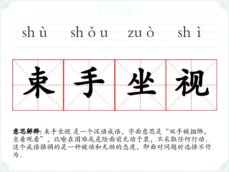 束手坐视 这个词汇强调了在困难面前不作为的消极态度。在语言学和表达中,理解这个词汇的含义和用法,有助于更好地表达和理解人们在面对挑战时的不同态度和行为。通过深入学这个词汇,可以更准确地描述和分析人们在特定情境下的行为和反应。