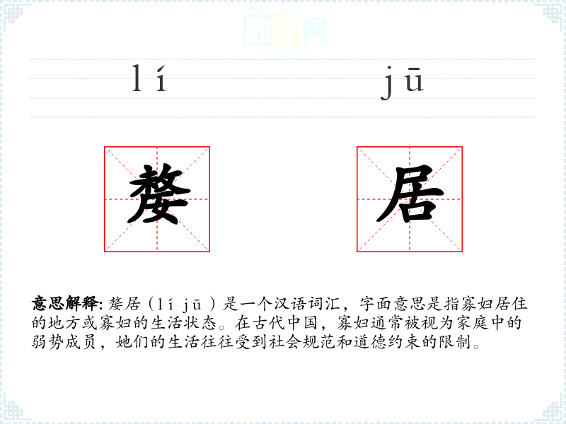 嫠居一词虽然现代使用较少,但它反映了古代社会对寡妇的特定看法和待遇,是了解*传统文化和社会结构的重要词汇。在语言学和表达中,了解这样的词汇有助于更深入地理解文化背景和社会历史。