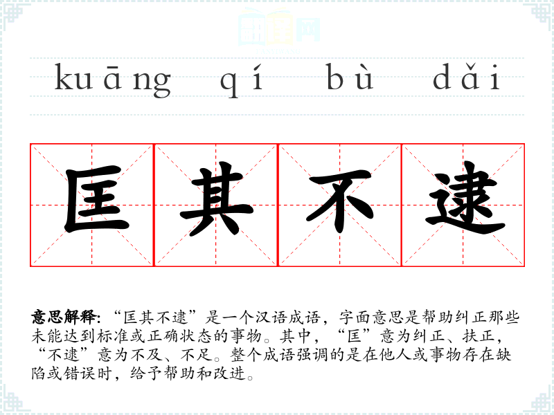 在英语中,类似的表达可能是“help someone improve”或“correct someone's mistakes”,但这些表达没有“匡其不逮”这样的成语所蕴含的深刻文化和历史背景。
