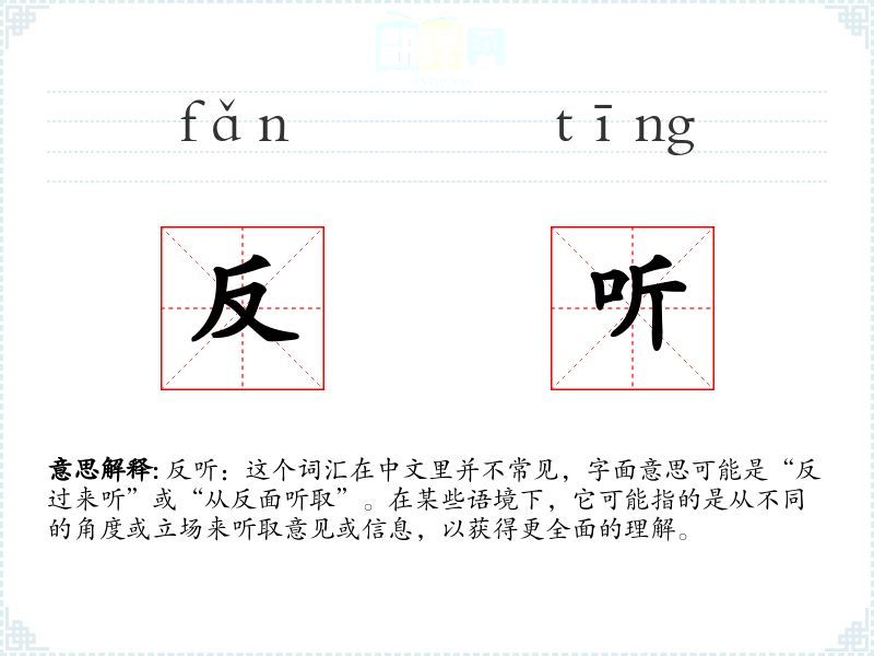"反听"的意思解释、反听是什么意思由翻译网汉语词典查词提供。