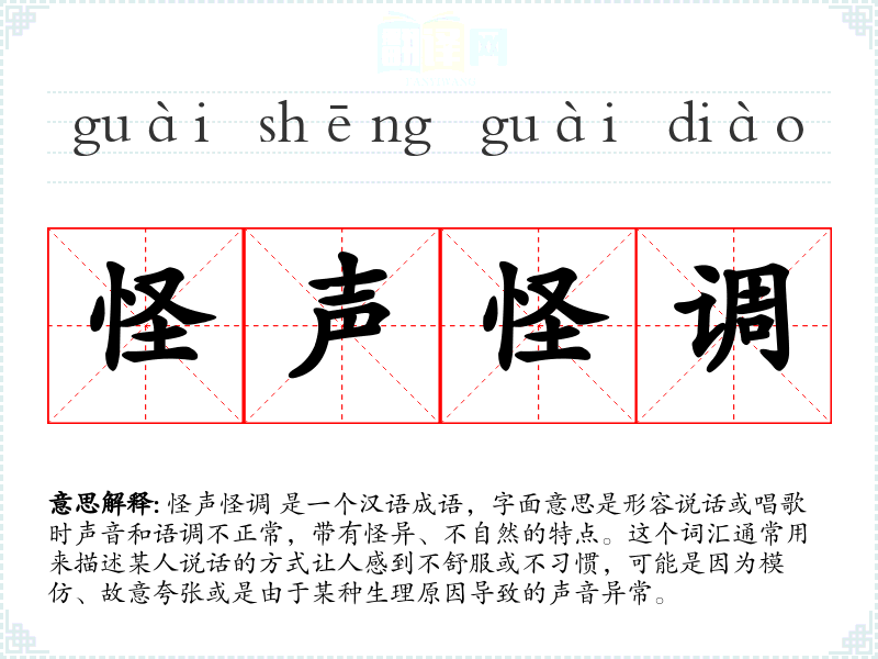 怪声怪调 这个词汇的词源较为直接,由“怪声”和“怪调”两个词组合而成,用来形容声音和语调的异常。在语言的演变过程中,这个词汇的使用逐渐固定下来,成为描述声音异常的常用表达。