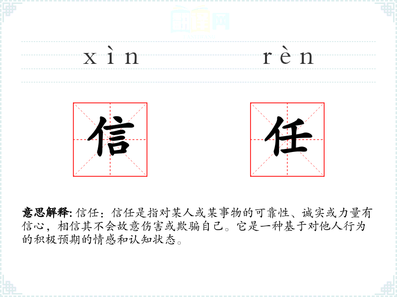 信任:信任是指对某人或某事物的可靠性、诚实或力量有信心,相信其不会故意伤害或欺骗自己。它是一种基于对他人行为的积极预期的情感和认知状态。
